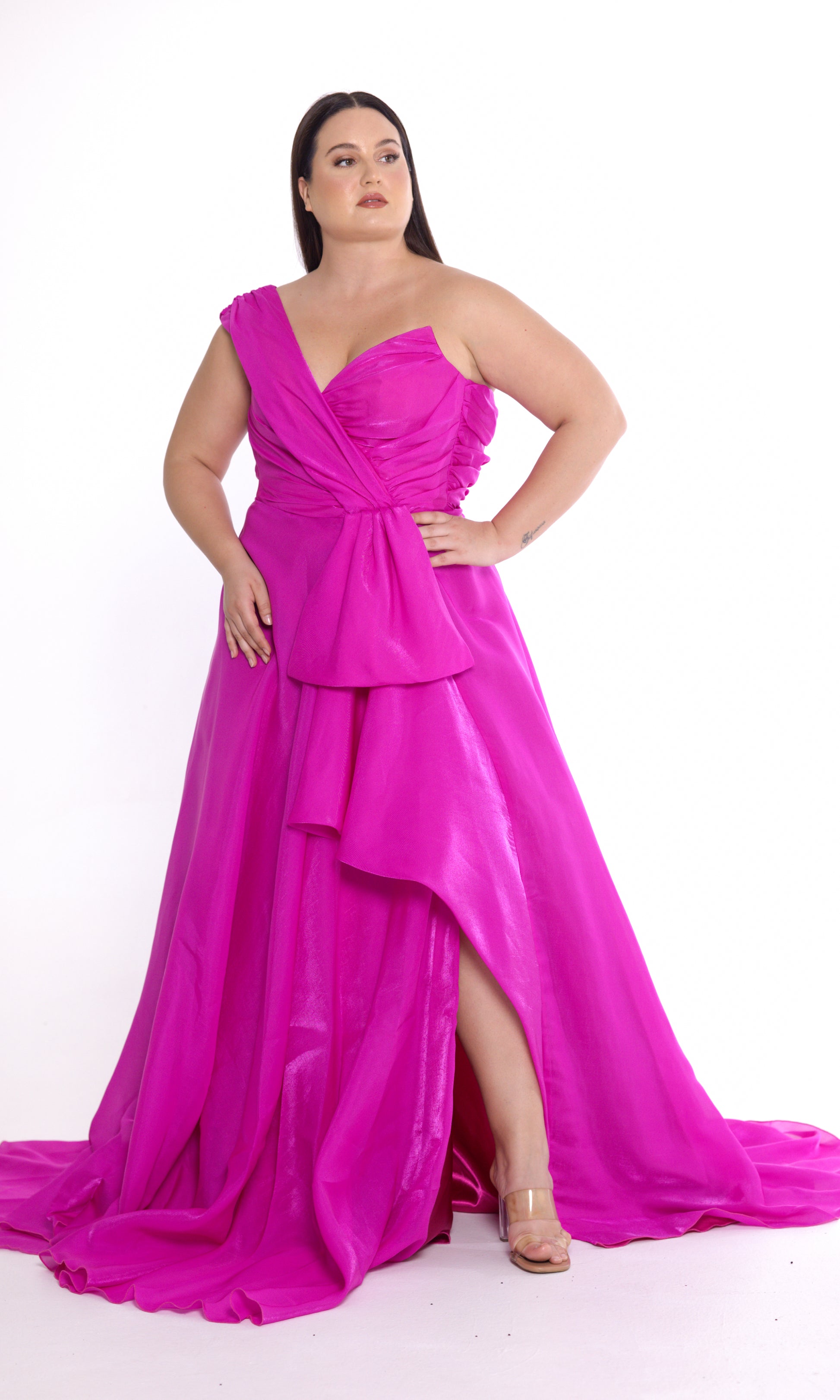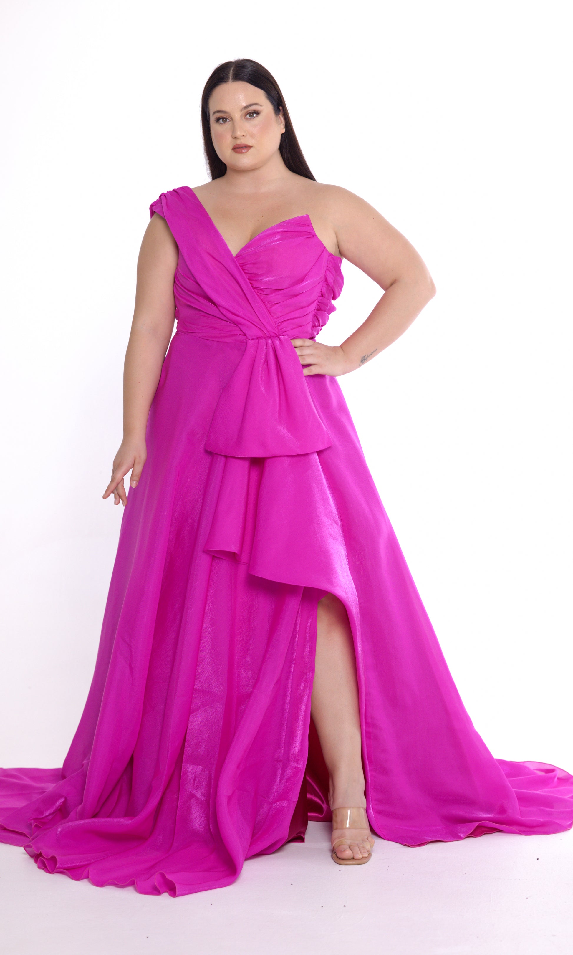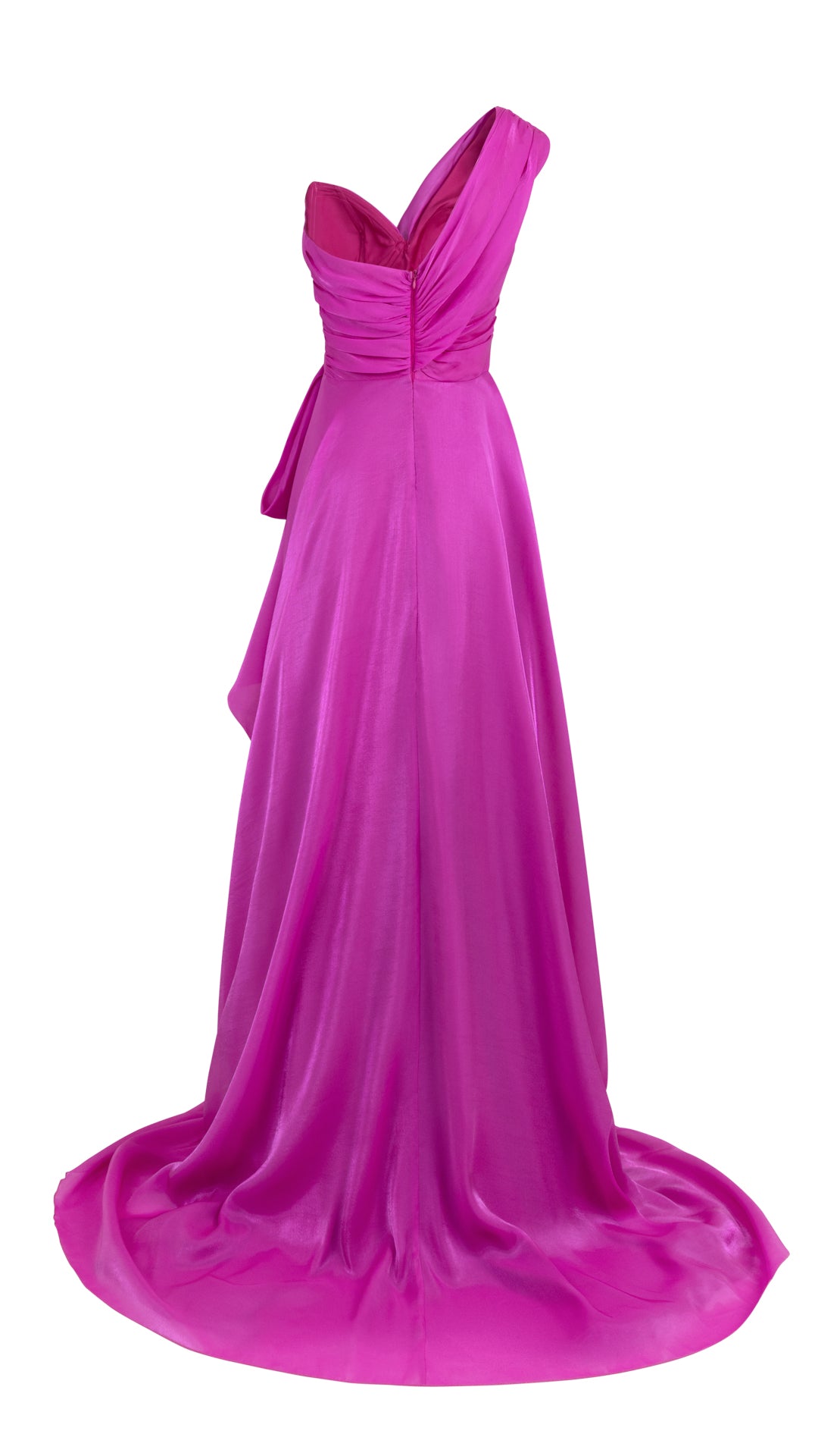 Elevate your evening wardrobe with this stunning one-shoulder dress, designed to captivate from every angle. Featuring a flattering A-line skirt and a delicately ruffled trim along the front, this dress combines elegance with a playful touch. The rouched bodice enhances the silhouette, offering a perfect fit and timeless appeal. A discreet back zip fastening ensures effortless wear, making this dress a must-have for weddings, galas, or special occasions. Expertly crafted with meticulous attention to detail, this piece is the epitome of sophistication. Perfect for those seeking a chic, one-shoulder evening dress that commands attention.